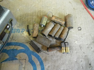 *外したコンデンサー、断線している豆球。